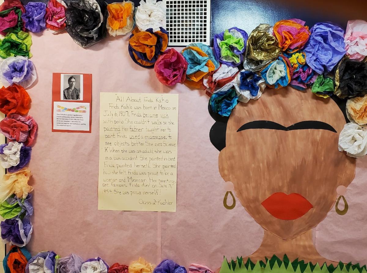 Art teacher Leah Bernabei and Antoinette Koehler’s second-grade class partnered to create a display about famed Mexican artist Frida Kahlo. Bernabei painted Frida’s portrait and signature facial features, while Koehler’s students created the tissue-paper flowers framing the display. Students learned and wrote a shared writing piece about Kahlo’s life. Bernabei said, “I love collaborating with classroom teachers to create projects like this. Not only does this particular display celebrate our diversity, but it sparks conversations throughout the whole school.”