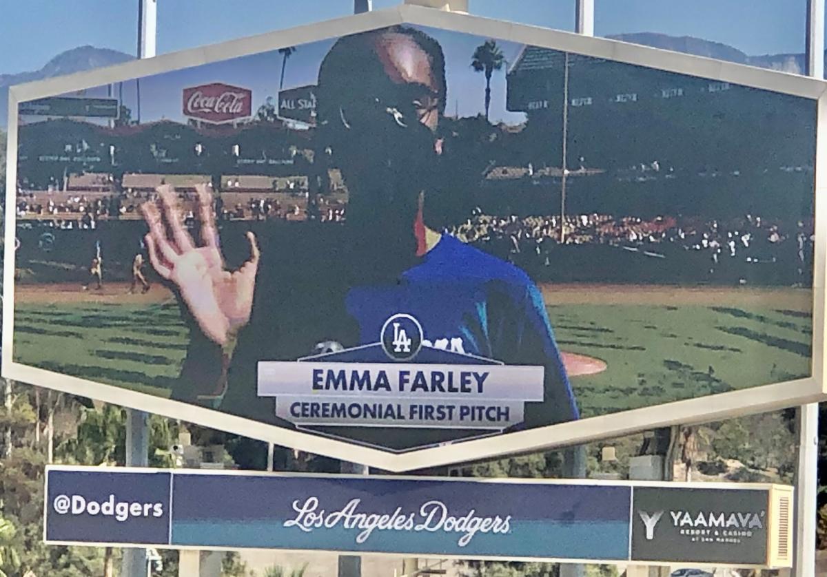 It was ceremonial, but you can now count New Rochelle High School junior Emma Farley among those who have thrown pitches at Dodger Stadium. (The photo shows Farley's image projected on the scoreboard.)