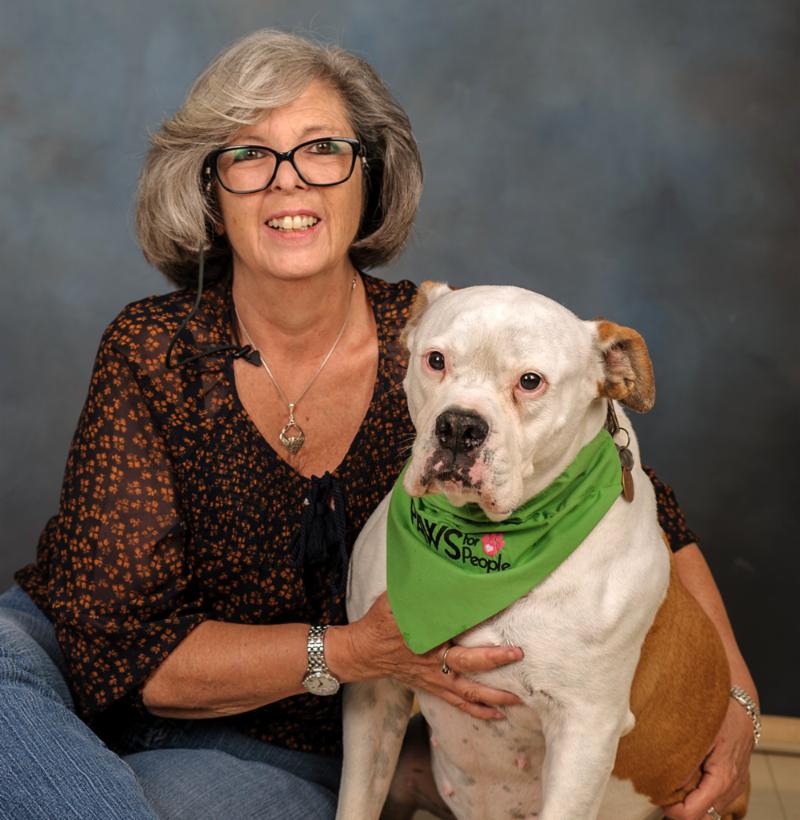 with her sweet American Bulldog, Callie, in 2012. Kathy learned about PAWS when her dog trainer noticed that Callie had a very calm temperament and a fantastic personality perfect for pet therapy work. Together, they regularly visit at