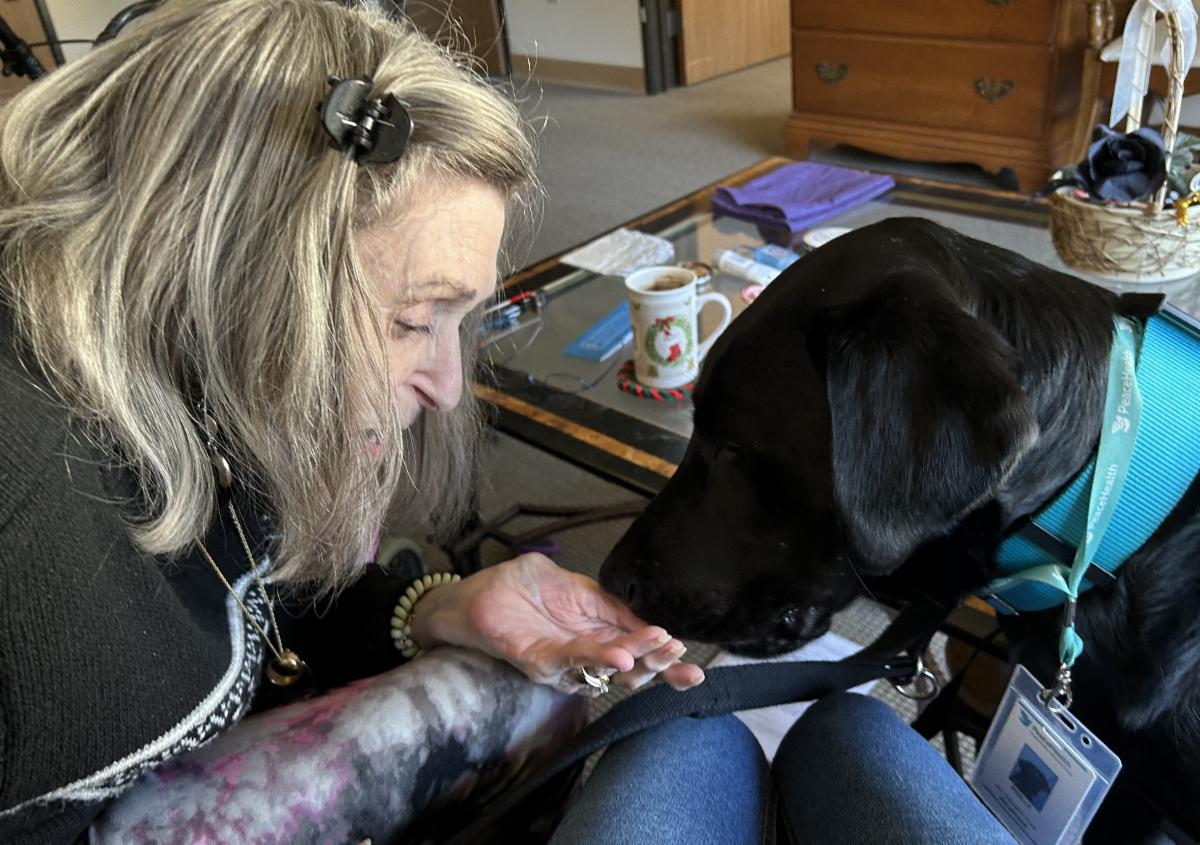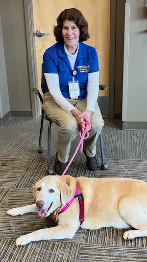 Handler Kathy always stops at the Chaplain office to ask what patients would benefit most from a visit with Reilly. Knowing which patients are missing their pet, helps Kathy to spend more time visiting. Kathy makes weekly visits to the lady in picture. She is very lonely and looks forward to her weekly Reilly visits.