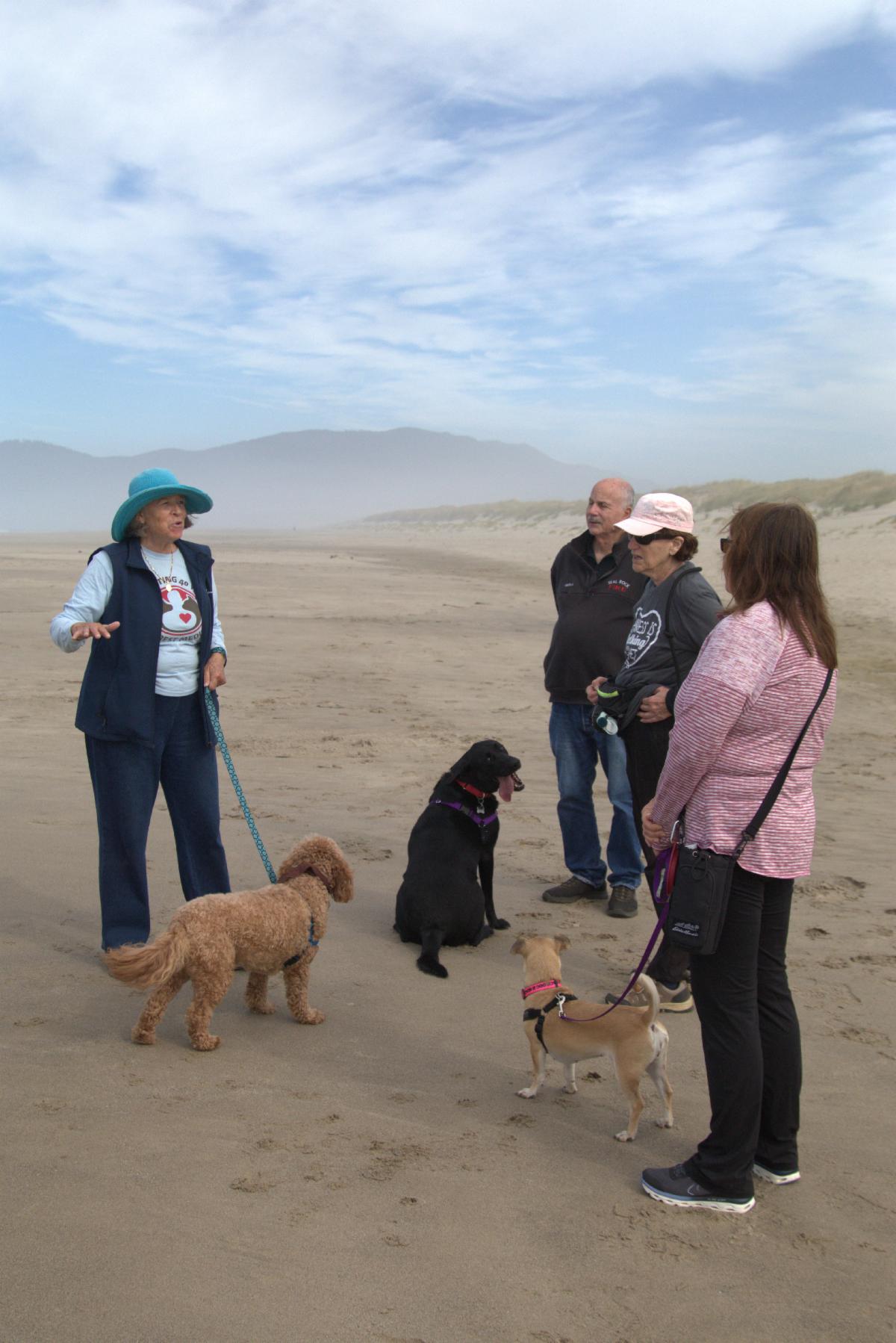 | | Pet Partners of the Oregon Coast chose Sitka Sedge located north of Pacific City as their Pet Partners Largest Pet Walk destination. Weather was perfect and the waves were putting on a spectacular show for our enjoyment. Our four legged friends enjoyed the soft sand between their toes. | | Walkers and puppies taking a break before heading back to the wooded trail and parking lot. | | |