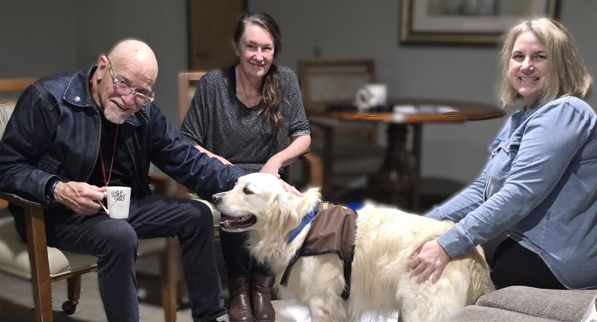 Handler Andeena and therapy dog, Whitley were asked to partake in a meditation session at an assisted living facility. They started with a Zen meditation and followed with a loving kindness meditation. During the loving kindness meditation, Whitley's health issue was the focus of a symbiotic expereince. Whitley took this opportunity to visit and say hello to different people in the group.