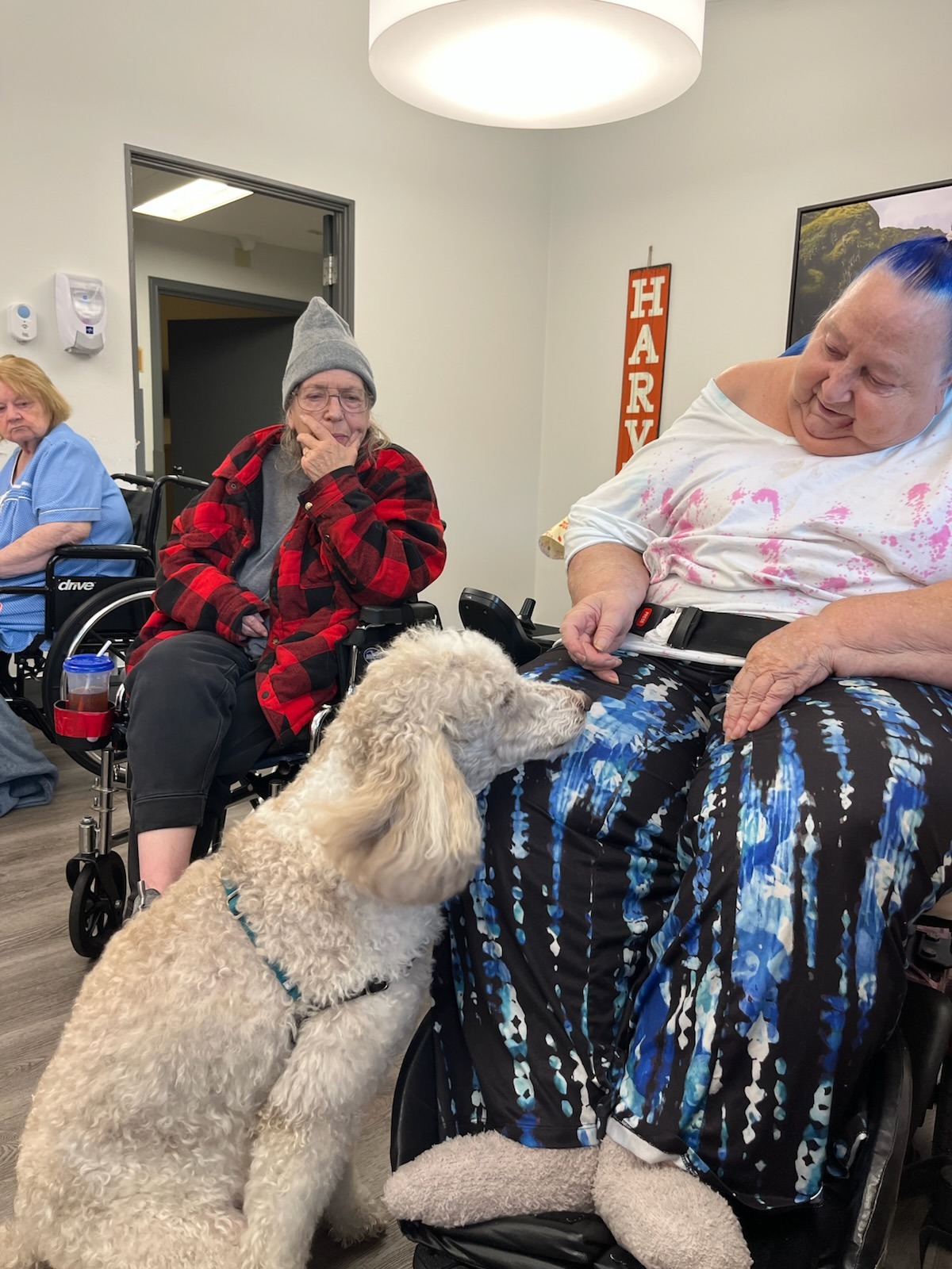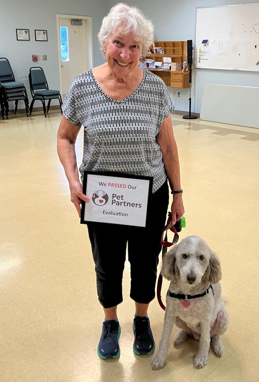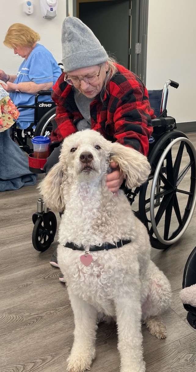 8-yr old standard poodle. They became a registered Pet Partners team in October, 2024. They live in Corvallis, Oregon and are currently making visits at Regency Recovery Center in Corvallis. From looking at these pictures of visits, Kizzy is enjoying her visits with these clients.