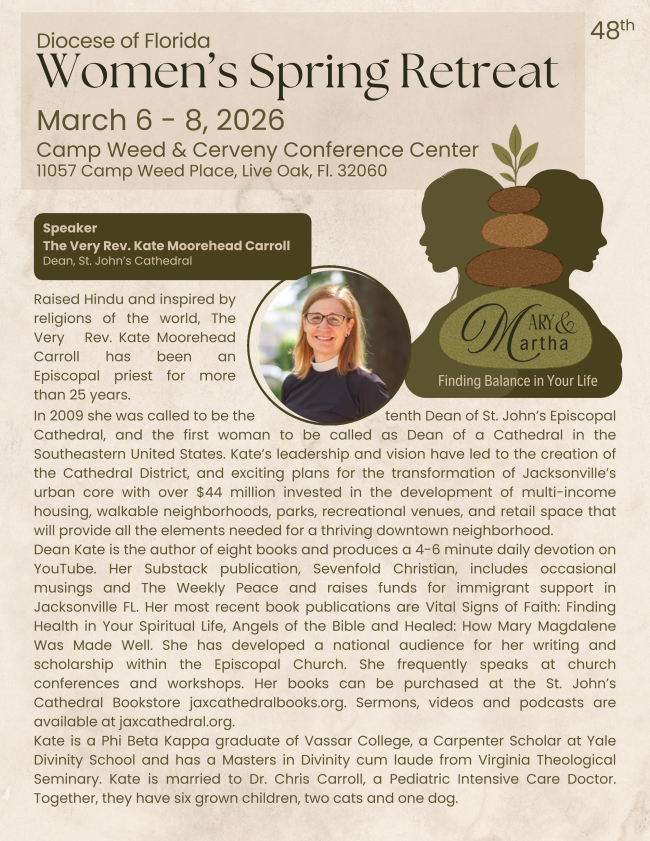 Whether you're new to our community or a long-time member, this weekend is a fantastic way to build meaningful relationships and encourage each other in our individual journeys. We'll have a great speaker, Dean Kate Moorehead Carroll, St. John’s Cathedral.