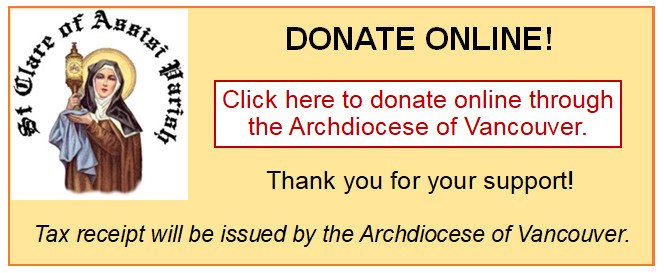 If you wish to book a Mass Intention, please send your request via email at stclareofassisi@shaw.ca giving the name of the person, whether it is for a living or deceased person, who it is from and if you have any preferences for the day of the week, a weekend mass or specific date. We will try to book your mass intention as close to the request as possible. Please note that there may be unforeseen situations when your scheduled date may be changed without notice.