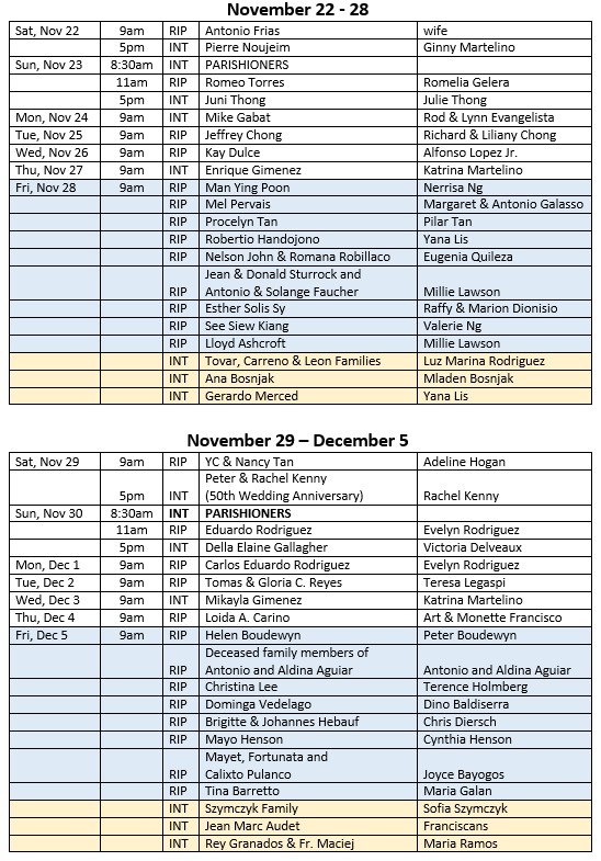 | | We are able to accept multiple Mass intentions on Fridays. For all other days, the priest can accept one intention only per day. | | |