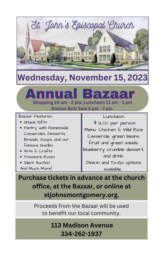 St. James Episcopal Church will host its annual bazaar from 9 a.m. to noon. The bazaar will feature a variety of homemade goodies including cakes, casseroles, soups, and other kitchen creations; crafts; and pottery, including St. James’s much loved pottery crosses, which are blessed by Fr. Rob Iler before the Bazaar. St. James parishioners work year-round to create the treasures available at the Bazaar. All proceeds benefit local community outreach programs. For more information, please contact Scotti Bozeman at scottibozeman@gmail.com.