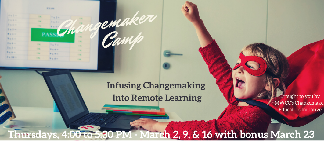 Sign up for our three-part Infusing Changemaking into Remote Learning Changemaker Camp, where we will support each other, develop and test concrete ways to build teacher-student connection, elevate student ownership over their learning in your class, and increase empathy. A fourth optional session is available for peer-to-peer feedback on new lesson ideas, techniques, etc. on March 23.