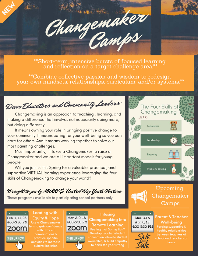 This Changemaker Camp meets on Tuesdays: March 2, 9, and 16 from 4:00 to 5:30 PM via Zoom. Pre-registration is required. Free to any participating Changemaker school/district staff. Click the graphic above to access the flyer for more information!