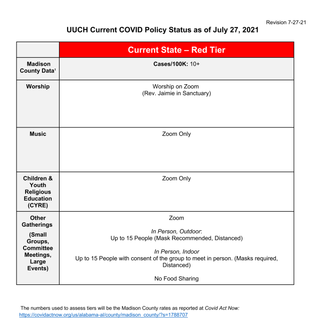 The Board discussed the current COVID policy and determined that we need to return to “Tier Red” because the number of cases have increased in our area. (See the article on the current policy level in this newsletter). In addition, new CDC recommendations about masks state that if you are in an area with high risks, unvaccinated and vaccinated people should be wearing masks in public; therefore, the UUCH Policy will now require masks at all indoor activities. The UUCH COVID policy is dynamic, and the Board will be monitoring local case numbers to ascertain when we might be able to return to more in-person activities.