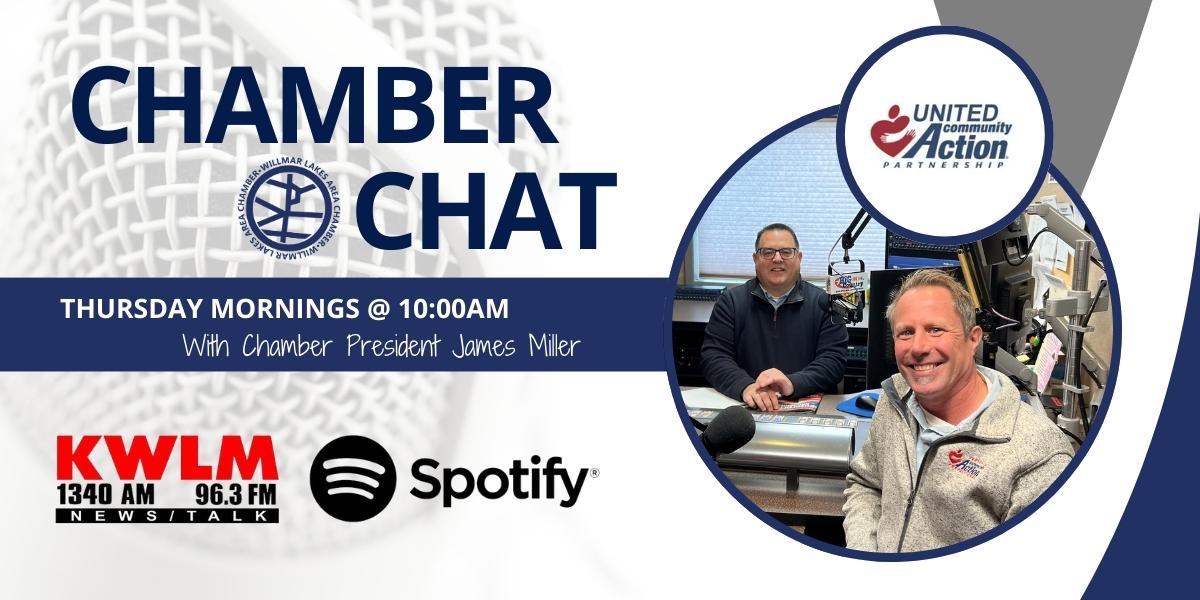| | Registration Closes Tomorrow! | | Join neXt for a family-friendly night of hockey, networking, and fun! Cheer on the Willmar WarHawks from the VIP Deck, connect with fellow young professionals, and enjoy great food, drinks, and camaraderie. Don’t miss this exciting evening that scores big on community and connections! | | Thursday mornings on Open Mic, Chamber President James Miller hosts Chamber Chat. Last week, James was joined in studio by Jon Marchand - Community Services Manager at United Community Action Partnership. | | |