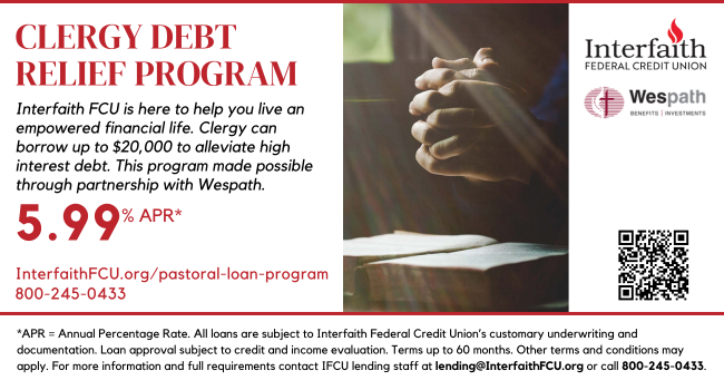 Interfaith Federal Credit Union understands answering the call to serve as clergy comes with unique financial challenges. Debt burden can impact peace of mind, and in turn the capacity to serve. Two lending programs have been created to support clergy in managing debt and living a more empowered financial life. The Pastoral Signature Loan offers up to $3,000 for up to 24 months at a lower rate. It is designed to help clergy avoid high interest long-term debt for unexpected expenses. The Clergy Debt Relief Program, made possible in partnership with Wespath, offers up to $20,000 to refinance and alleviate high interest debt at a great low rate. For information and rates, go to www.InterfaithFCU.org/pastoral-loan-program, email lending@InterfaithFCU.org, or call 800-245-0433.