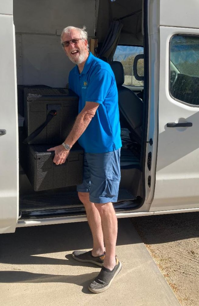 One outstanding volunteer is John Curley, who literally devotes his entire day each Tuesday to the Youth and Seniors of Borrego Springs. Each Tuesday morning he leaves his home in Borrego at around 6:30 AM for the one-hour-plus drive to Ramona to pick up meals for the homebound. He brings the meals directly back to the Senior Center where they are kept frozen and delivered twice a week to our homebound seniors. John then goes straight over to the Resource Center to begin helping with the Food Pantry, where he will be working until nearly 5 PM.