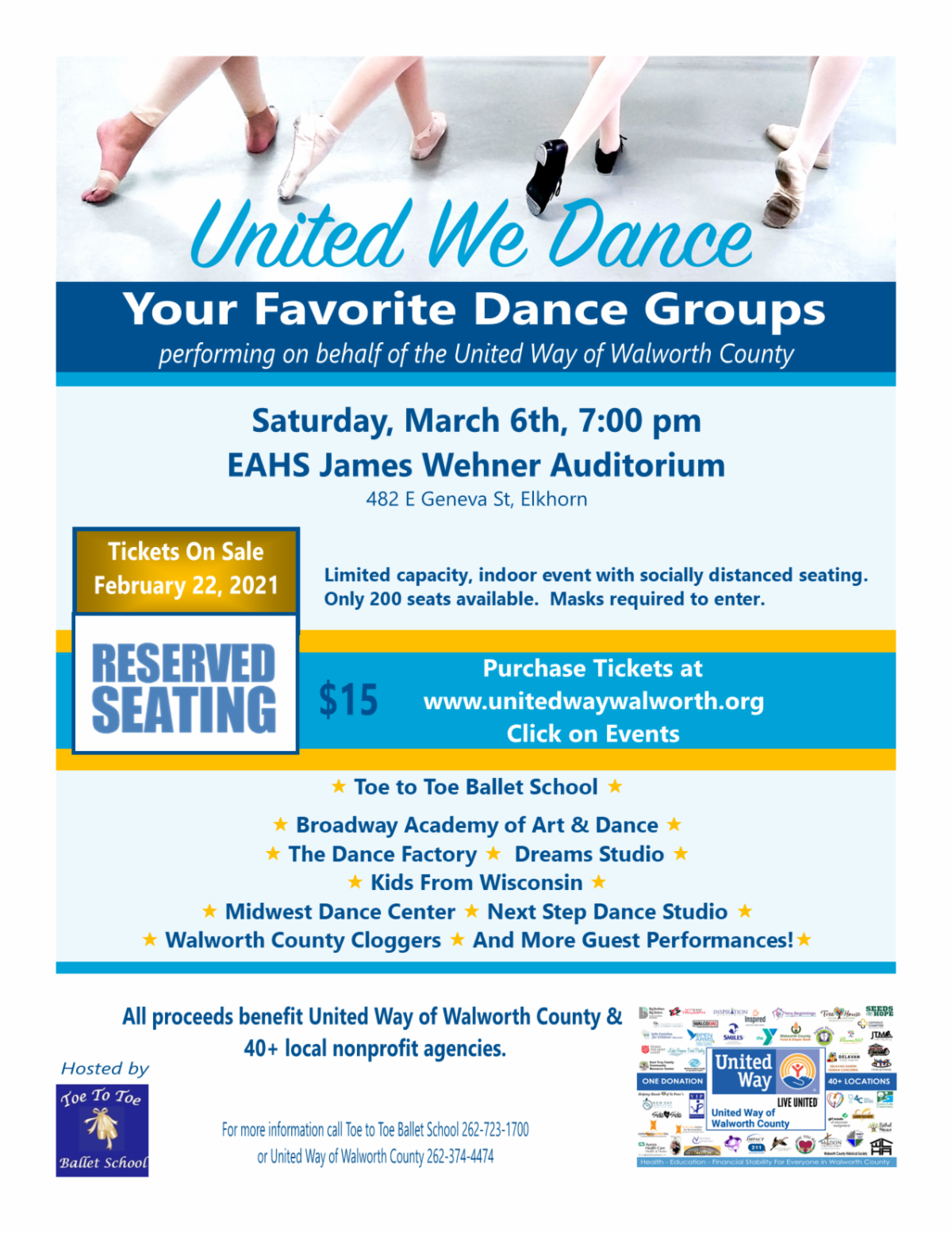 United Way of Walworth County and Toe to Toe Ballet School have announced that for the second year, United We Dance will be returning to Elkhorn, Wisconsin. The event will be at 7 p.m., Saturday, March 6th, in the James A. Wehner Auditorium at Elkhorn Area High School.