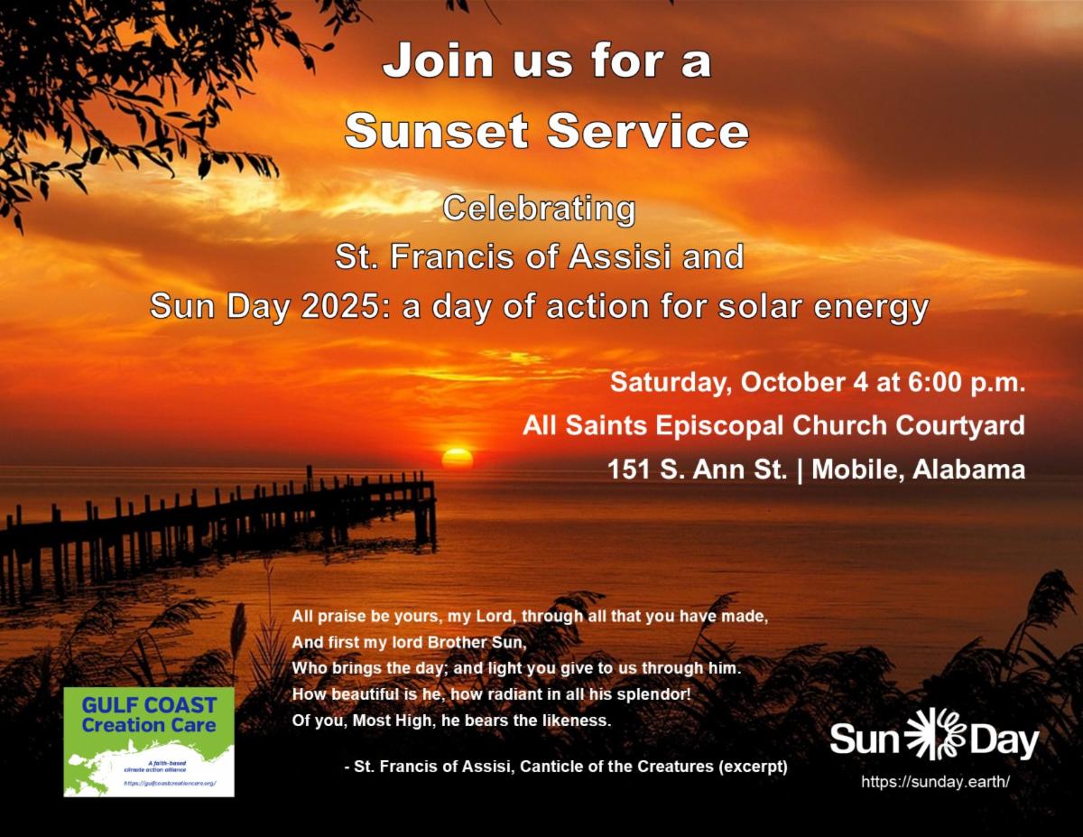 Sun Day is a national day of action celebrating the power of clean energy. Gulf Coast Creation Care is inviting churches in Alabama to host a postcard writing campaign on Sunday, September 21, asking our elected representatives at the Alabama Public Service Commission to update regulations to encourage, rather than deter, solar power in Alabama.