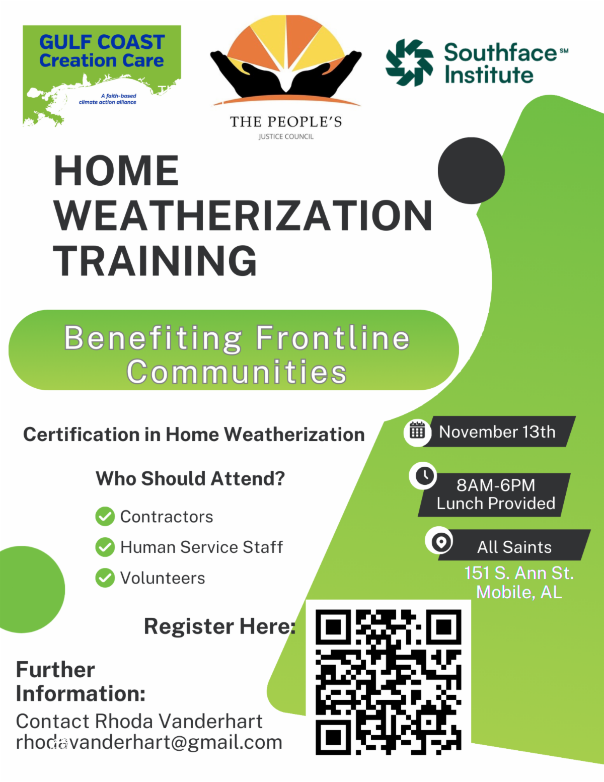 The People's Justice Council and Gulf Coast Creation Care are offering a Home Weatherization and Resilience Specialist Training for south Alabama. Participants will become certified in weatherization and complete 8 modules to master strategies to make a home energy efficient and resilient. Training takes place at All Saint Episcopal Church, Stirling Hall, 151 South Ann St., Mobile, AL 36606.