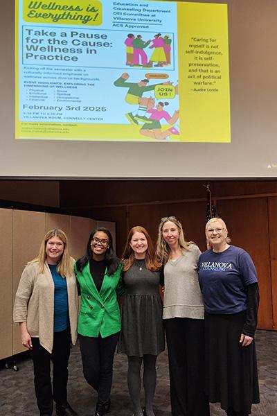 | | | | Taking a "Pause for the Cause" | Counselors and teachers often urge their clients and students to remember the importance of self-care, but they do not always apply the notion to themselves as professionals. In February, the department hosted an event focused on all dimensions of wellness (physical, emotional, intellectual, financial, spiritual, social, occupational and environmental). Thanks to the efforts of Amber Haley, PhD, and Krista Malott, PhD, students, faculty and other members of the Villanova community had the opportunity to learn about the eight dimensions of wellness through an interactive community event called, “Take a Pause for the Cause: Wellness in Practice.” Representatives from offices across Villanova and agencies beyond campus shared resources and tips. | |