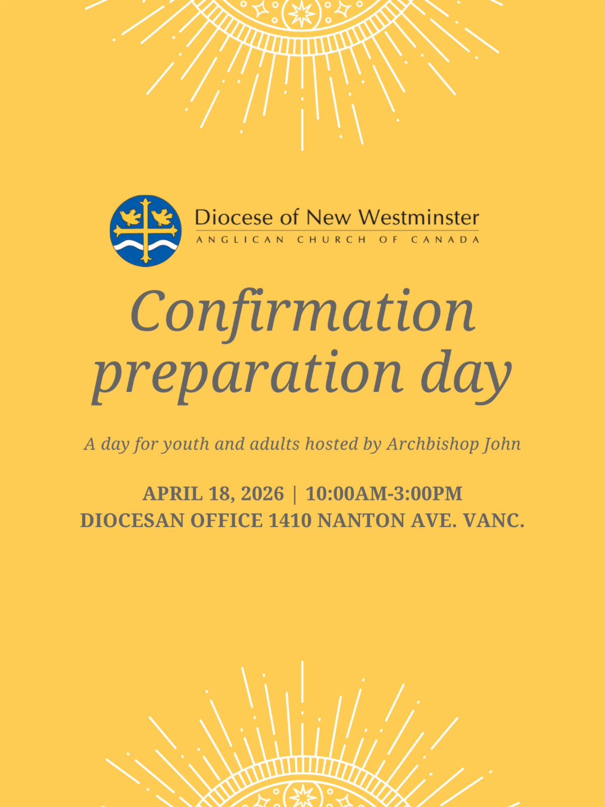 Archbishop John Stephens and the Mission and Ministry staff of the Diocese of New Westminster invite all those being confirmed, reaffirmed or received into the Anglican Church this year to join us for a day of learning, conversation and worship.