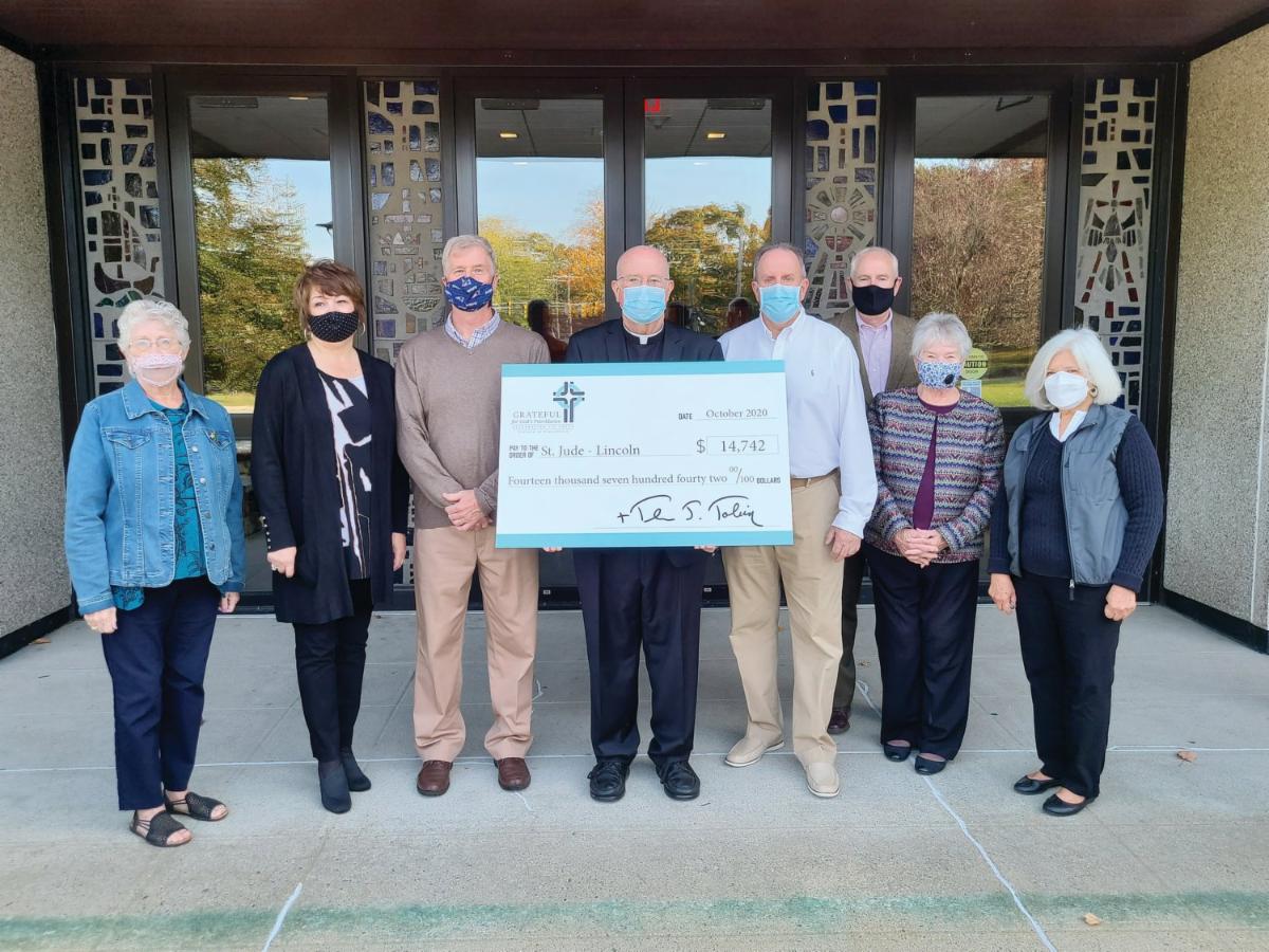 St. Jude parishioners receive their parish rebate check. Pictured from left to right are Peggy O’Neill, Cindi Daigneault, Richard Daigneault, Father Bernard C. Lavin, Gary Stott, Mike Speidel, Sister Mary Higgins and Carolyn Spagnole.