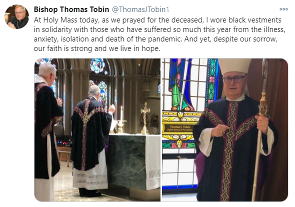 The Most Reverend Thomas J. Tobin, Bishop of the Roman Catholic Diocese of Providence, celebrated Holy Mass for the faithful departed at the Cathedral of Saints Peter and Paul, Providence, on All Souls Day, Monday, November 2 at 12:00 noon.