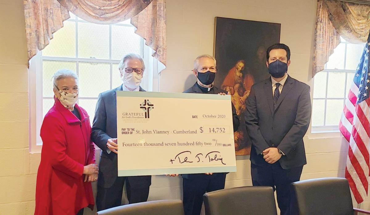 Pictured from left to right, parishioners Joanne Speroni-Woody, Michael Woody, Father Joseph Pescatello, pastor of St. John Vianney Church, and Tim McCaig, director of stewardship and development for the Diocese of Providence.
