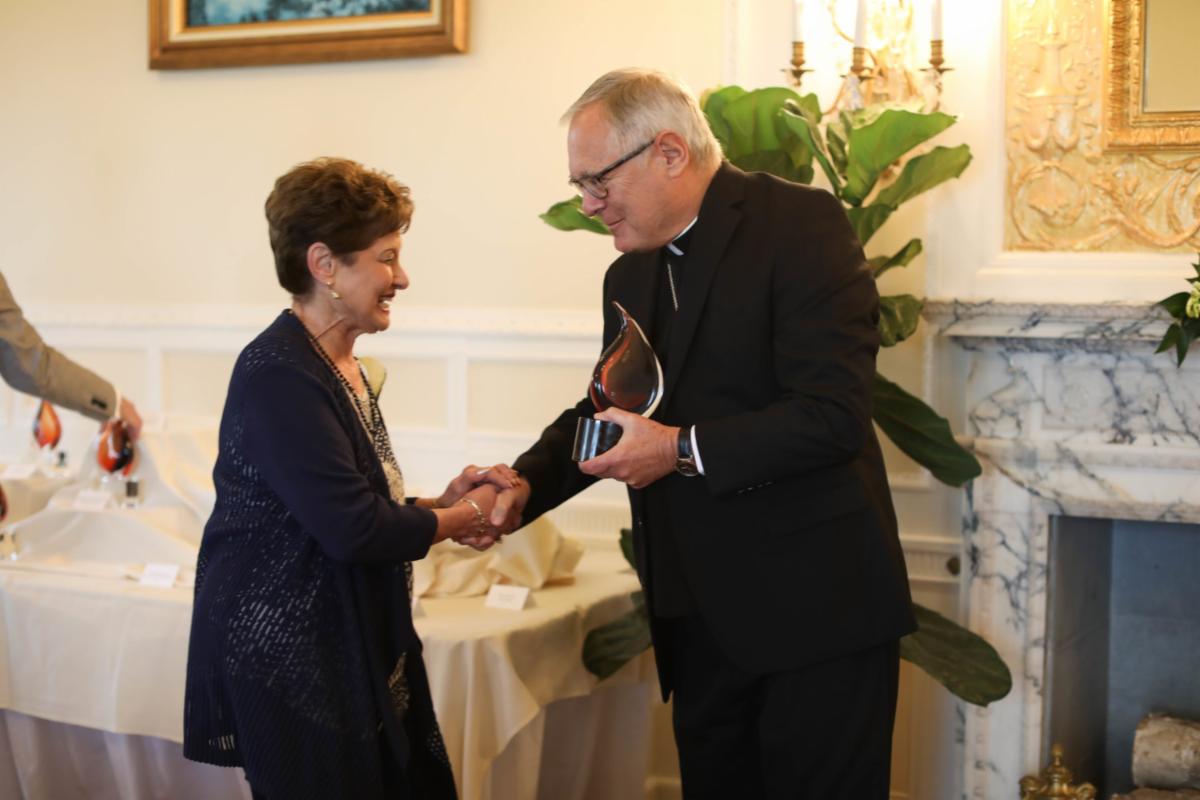 Many were honored with the 2020 Lumen Gentium Award on Thursday, Sept. 9, at the Aldrich Mansion in Warwick. Above, Lillian McIntyre, St. Philip Church, Greenville, was presented a Lifetime Achievement Award in Catholic Education by Bishop Thomas J. Tobin. Photo: Laura Kilgus, Assistant Editor, RI Catholic