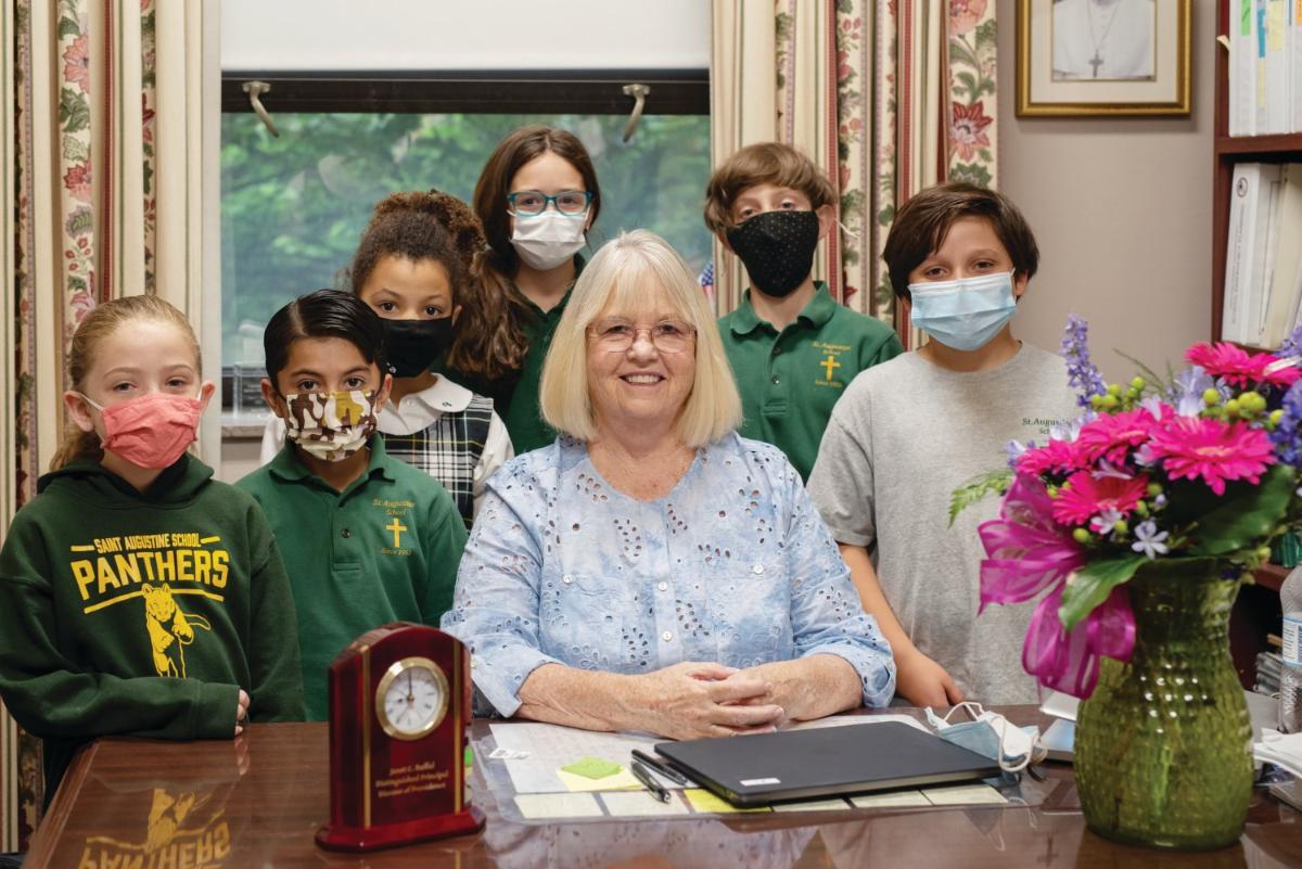St. Augustine School Principal Janet Rufful smiles with students after being awarded with the 2020 Diocese of Providence Distinguished Principal of the Year Award. The award presentation had been previously postponed due to the COVID-19 pandemic. (Photo: Joan Corey)