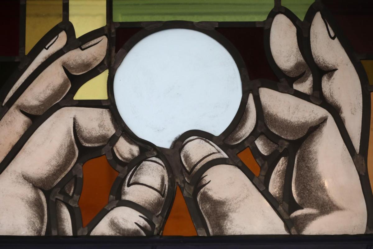 Elevation of the Eucharist is depicted in a stained-glass window at St. Anthony's Church in North Beach, Md.,