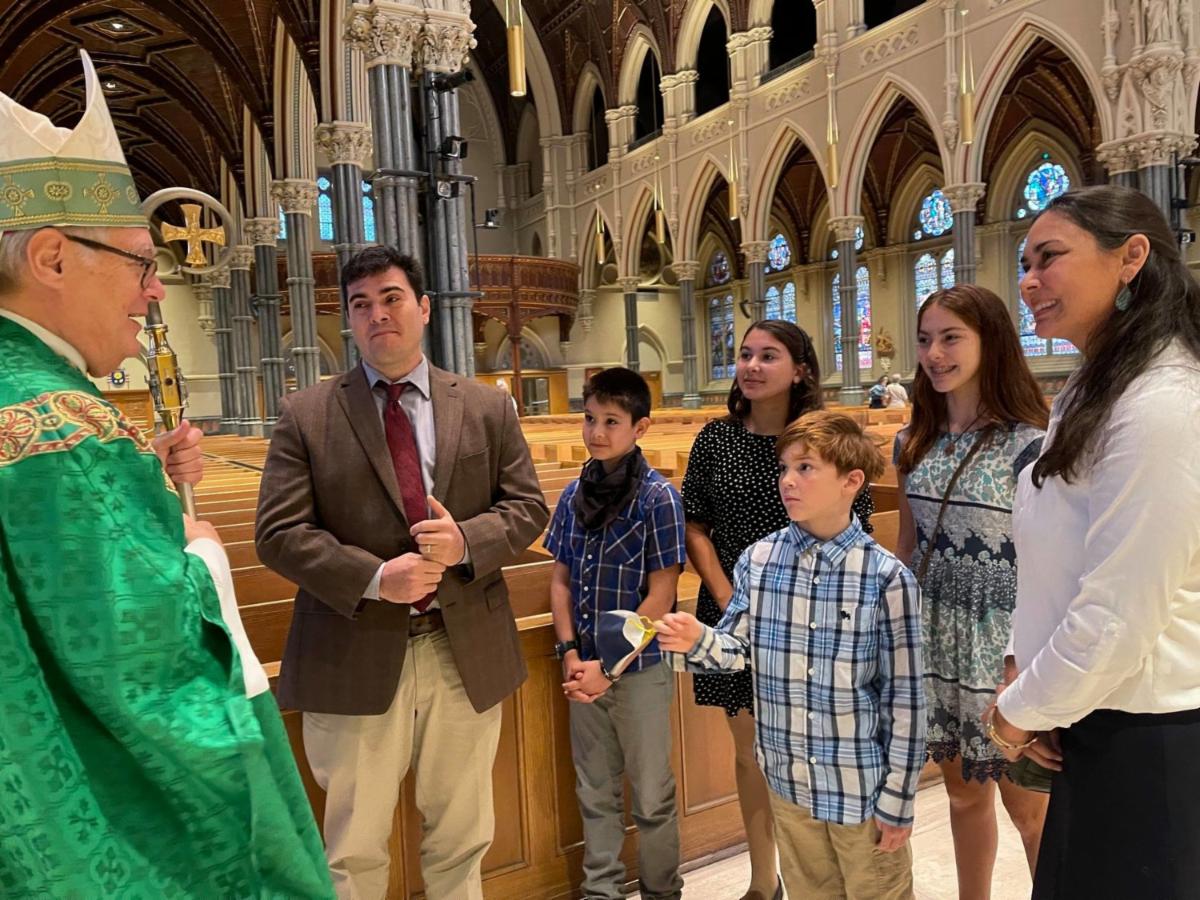 Bishop Thomas J. Tobin celebrated Holy Mass Sunday at the Cathedral of SS. Peter and Paul to open the diocesan phase of the worldwide “Synod on Synodality” called for by Pope Francis. A local committee will meet over the next few months as part of the synodal process to discern ways to broaden participation in the Church by the faithful. Following the Mass, Bishop Tobin greeted committee member Miguel Romero, Th.D., a Salve Regina University theology professor who attended the Mass with his children, from left, Oscar, 10; Maria Iliana, 12; Simon, 7; and Ana Lucia, 15; and wife Heather Romero, Ph.D. (Photo: Rick Snizek, Executive Editor, RI Catholic)
