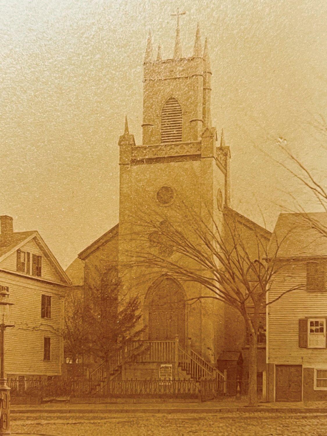 A rare view of the original Church of SS. Peter and Paul, one of the early stone churches built in Providence, where Mass was first celebrated on March 10, 1837. The cornerstone was laid on the site 41 years later, on Nov. 28, 1878, for the current Cathedral of SS. Peter and Paul. (Photo courtesy of Fr. Robert Hayman/Diocesan Archives)