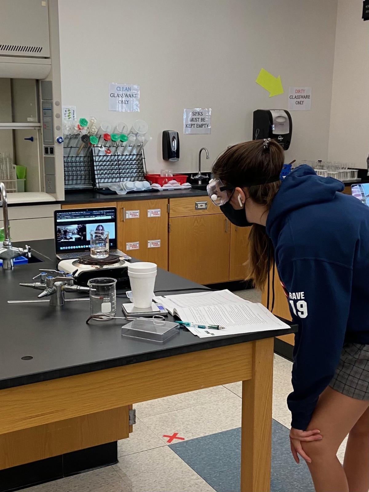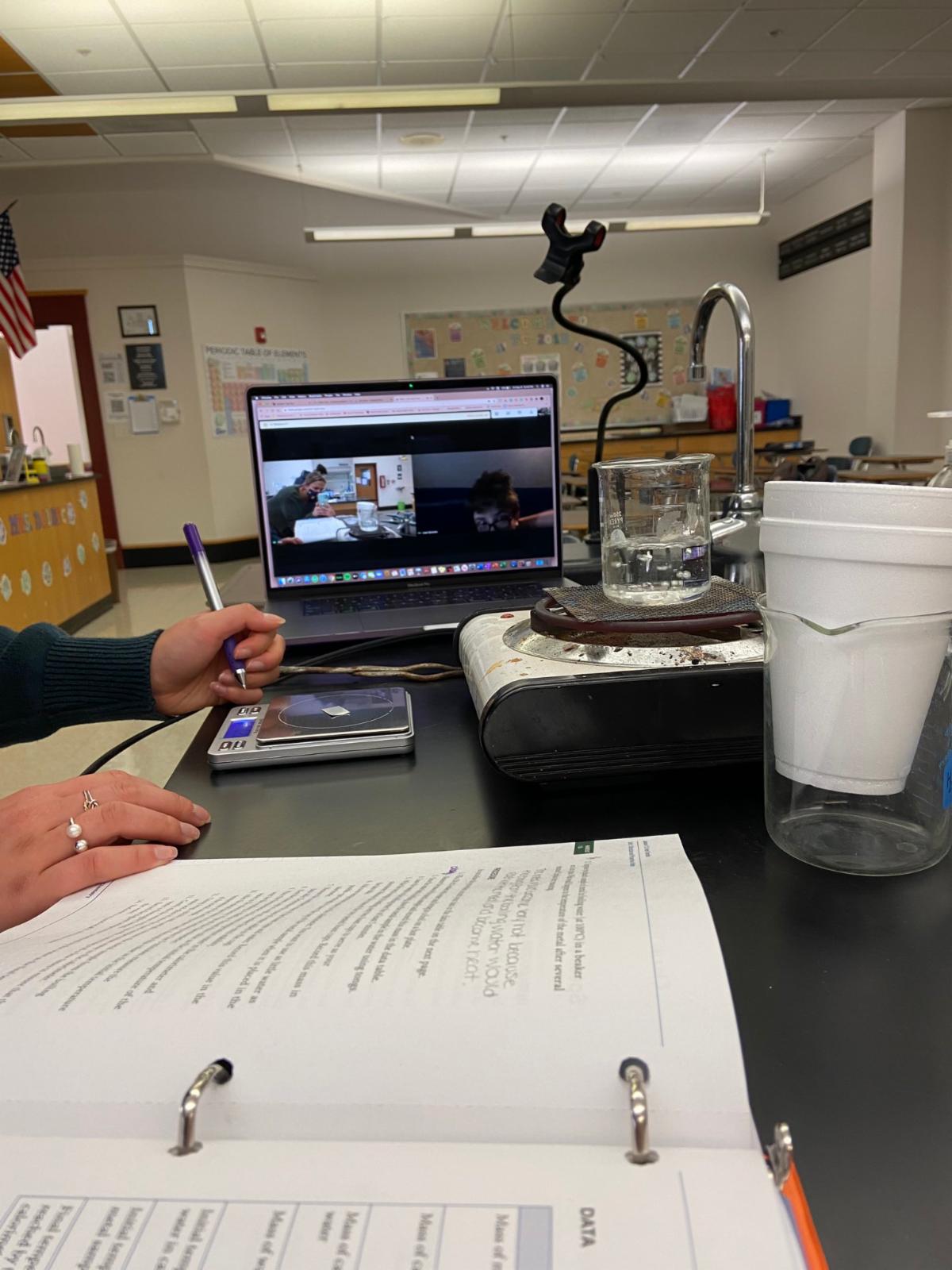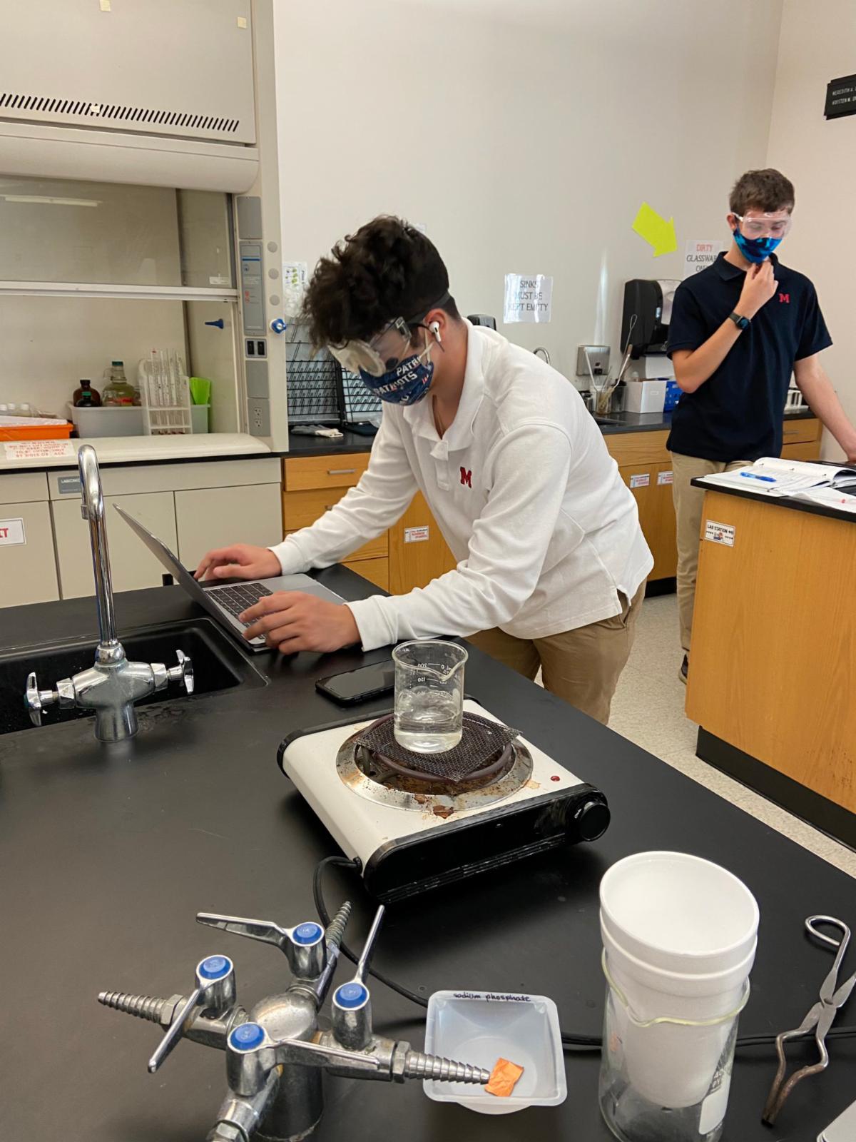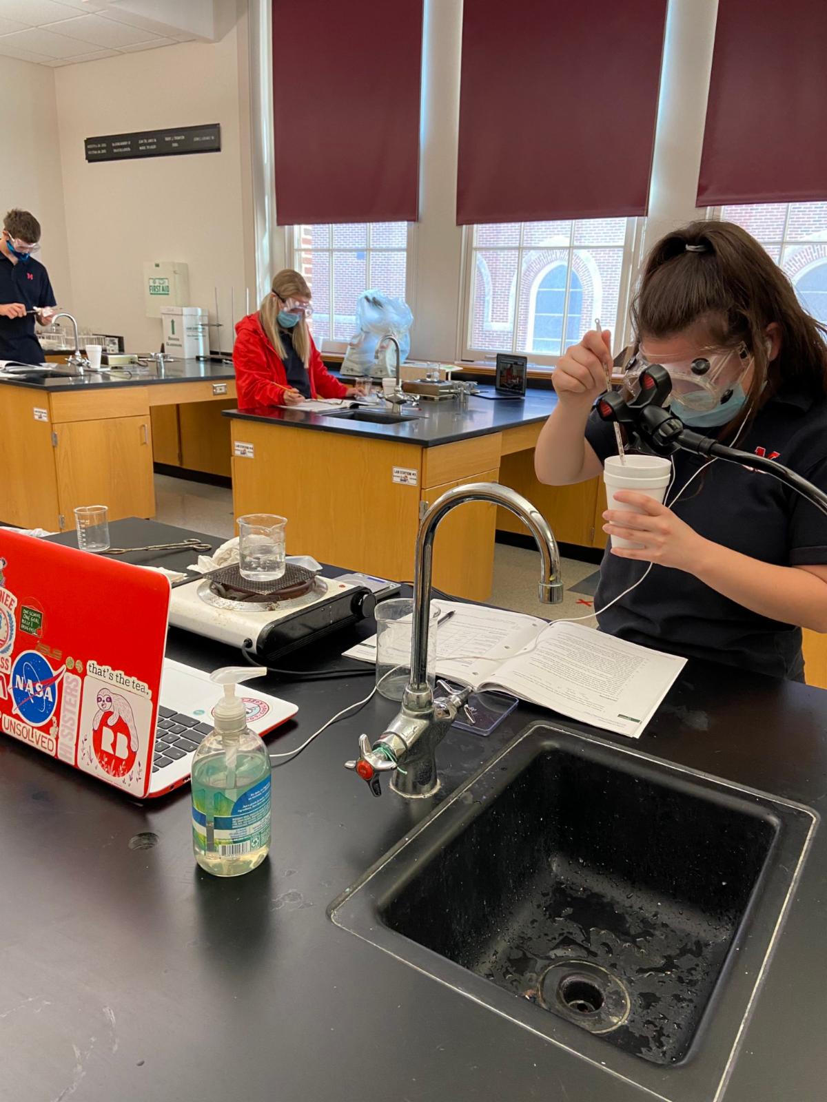 Mount Saint Charles Academy, 6-12, Woonsocket, Pre-AP Chemistry classes calculating specific heat of unknown metal samples. Working hard, staying safe. Nice job Mounties!