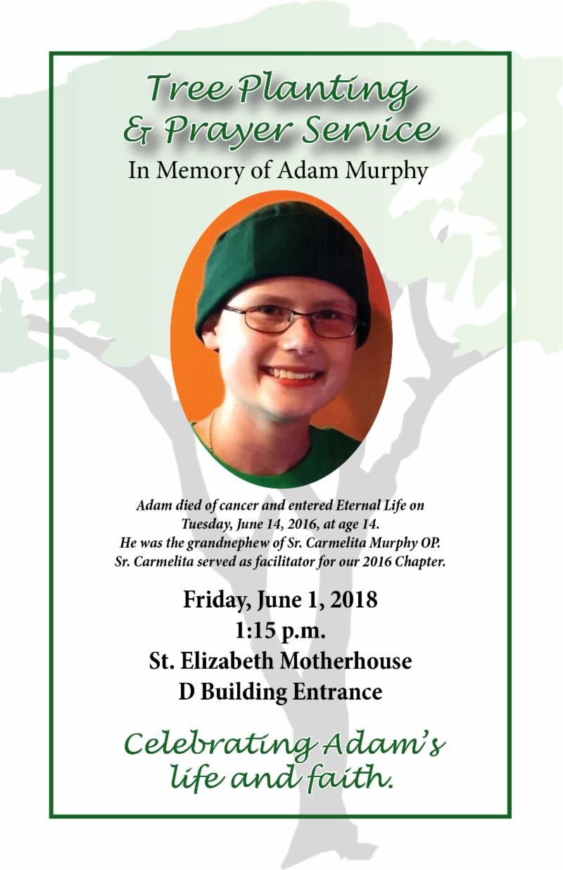 Many of us will remember our 2016 Chapter facilitator, Sr. Carmelita Murphy O.P. On the morning of our first Chapter Planning Committee meeting, Carmelita received a very difficult phone call from her family saying that her 12-year-old grandnephew, Adam, was diagnosed with cancer. All of us prayed for Adam, Carmelita, and the family through a two-year courageous battle which ended on June 14, 2016, just about a month before Chapter. One of our gifts to Carmelita was to have a tree planted in memory of Adam.