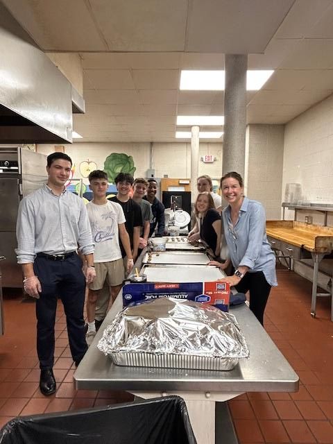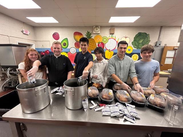 Campus Ministry prepared its first shelter meal of the year on September 18th for the South Park Inn. Fr Daniel stopped in to help alongside our new Campus Minister, Mr. A.J. Rocco, who was joined by Mrs. Cavanaugh and students- Jane Chomick, Alex Shah, Ryan Cline, and Bryce Abrahams. They cooked up some Spanish rice and broccoli with roasted chicken for the individuals at South Park Inn.