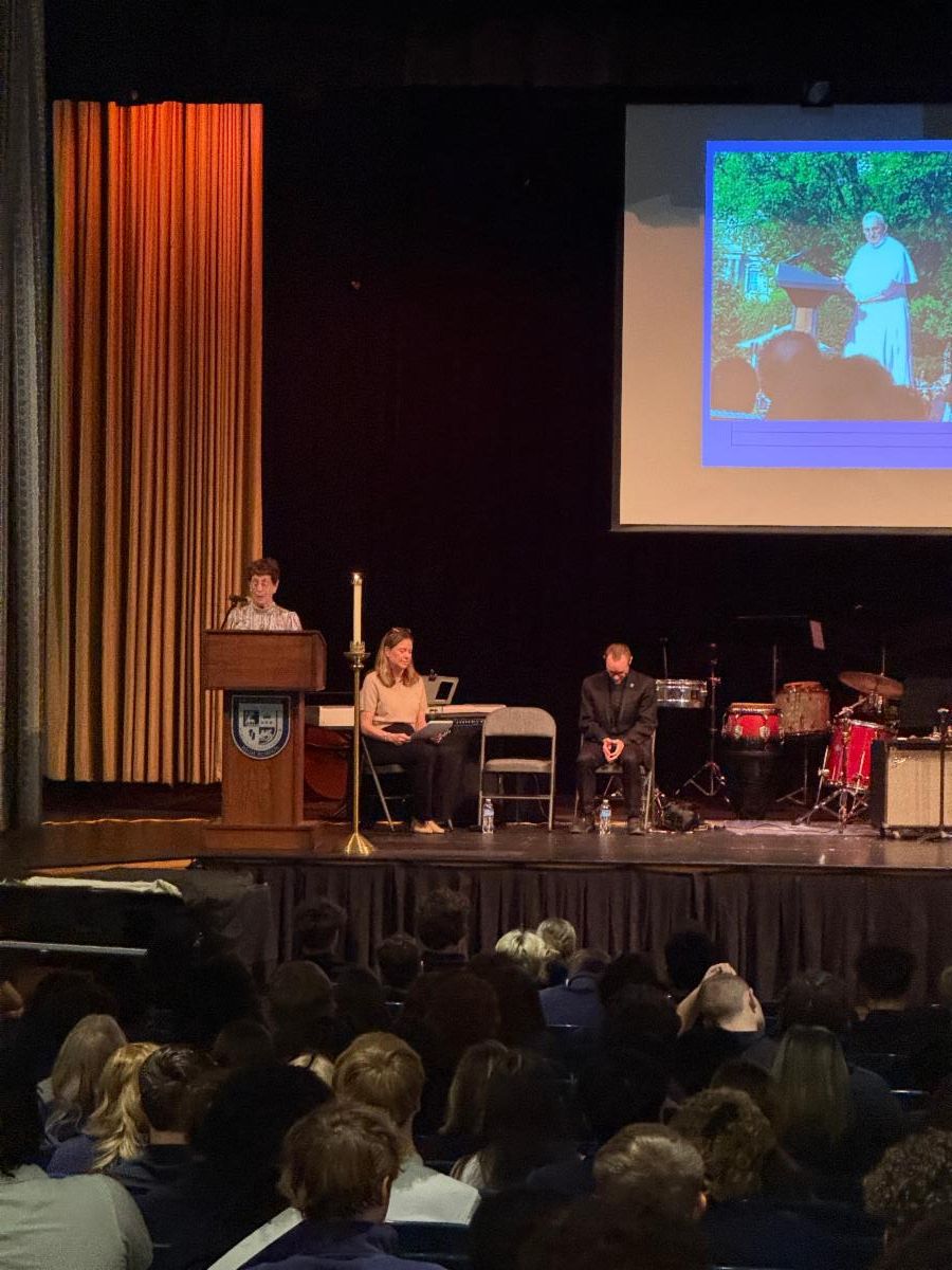 Campus Ministry held a schoolwide memorial service for Pope Francis on Monday, April 28th. The Prayer Service was led by Father Matt and several peer ministers, with an introduction from Mrs. Cavanaugh and a reflection from Sister Peggy. Campus Ministry has also created a display on the bulletin board outside their office to honor the life of Pope Francis.