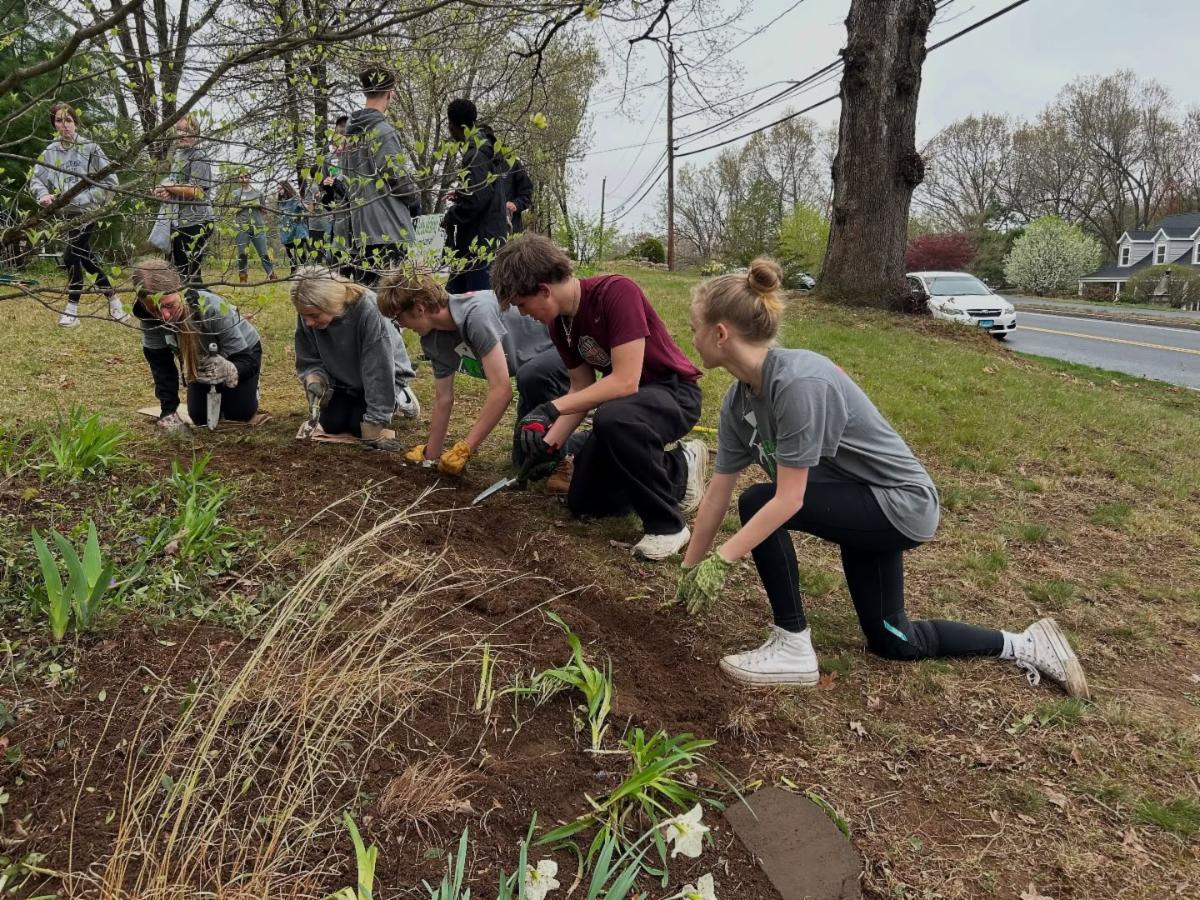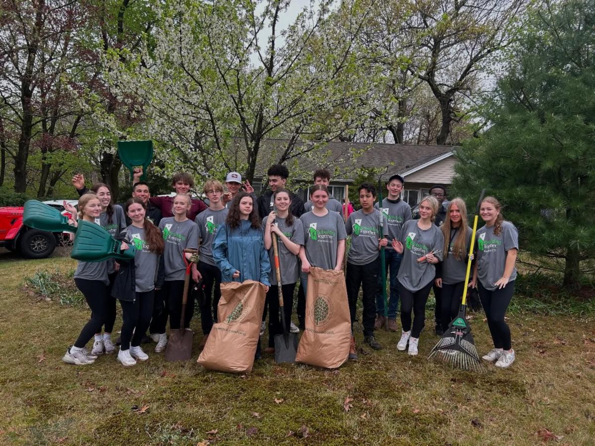 An East Catholic team of 18 students and two staff members rallied in the drizzle on Saturday, April 26 to take part in National Rebuild Day with Rebuilding Manchester, an organization dedicated to helping the Manchester community thrive. For three hours, the team assisted a disabled Manchester homeowner with heavy yard work tasks like tree trimming, hedging, weeding, and leaf gathering.