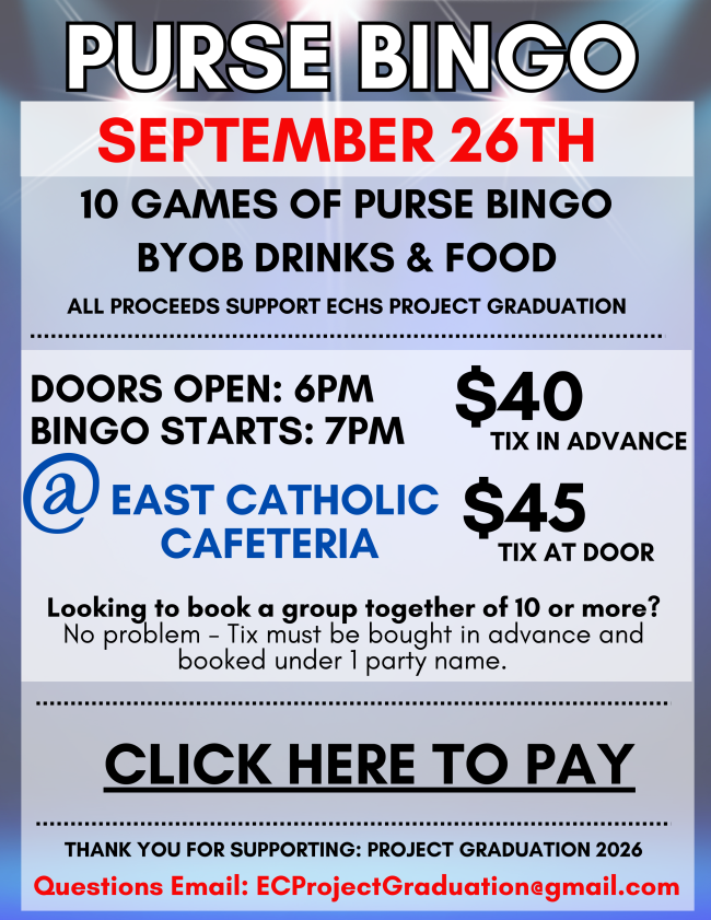 Get ready to shout "BINGO!" Our annual Purse Bingo event is back on Friday, September 26th! Grab your friends for a fun night and a chance to win a stylish designer handbag, all while supporting the ECHS Class of 2026 Project Graduation.