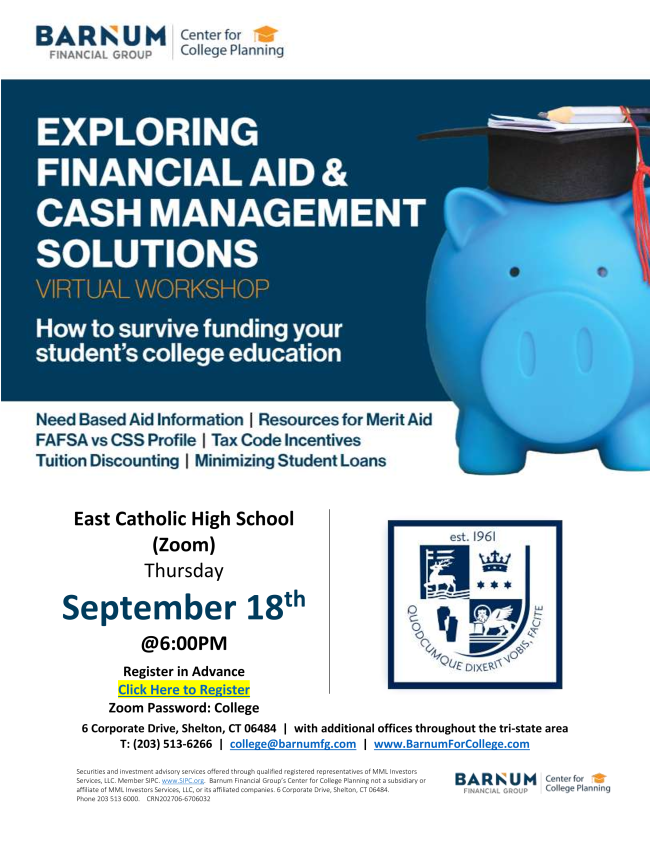 We're excited to announce our College Funding Workshop presented by Barnum Financial is scheduled for Thursday, September 18th at 6:00 PM via Zoom. This virtual workshop is ideal for families of senior and junior students who are actively planning for college, but we encourage freshman and sophomore families to attend and begin gathering information!