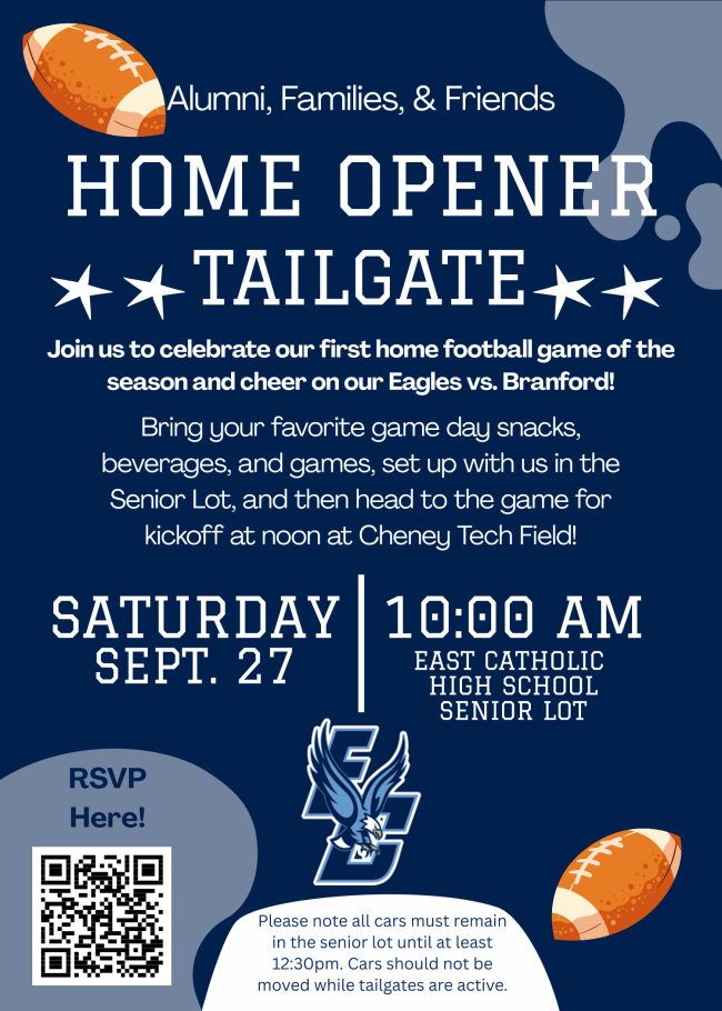 Bring your favorite game-day snacks, beverages, and games, and meet us in the senior lot! This is a great opportunity to reconnect with old classmates and cheer on the next generation of East Catholic Eagles.