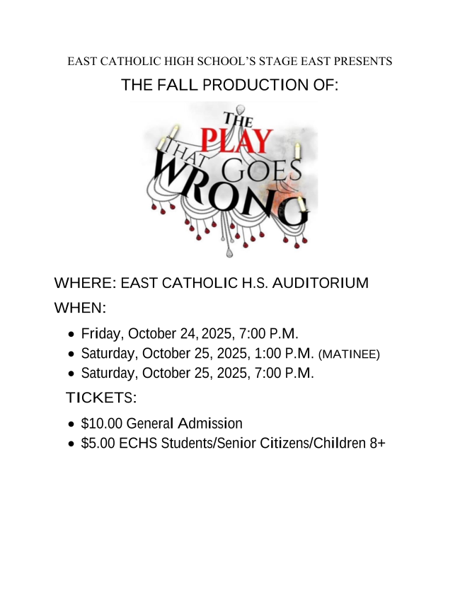 East Catholic High School's Stage East presents: The Play That Goes Wrong! Get ready for a night of laughing until your sides hurt.