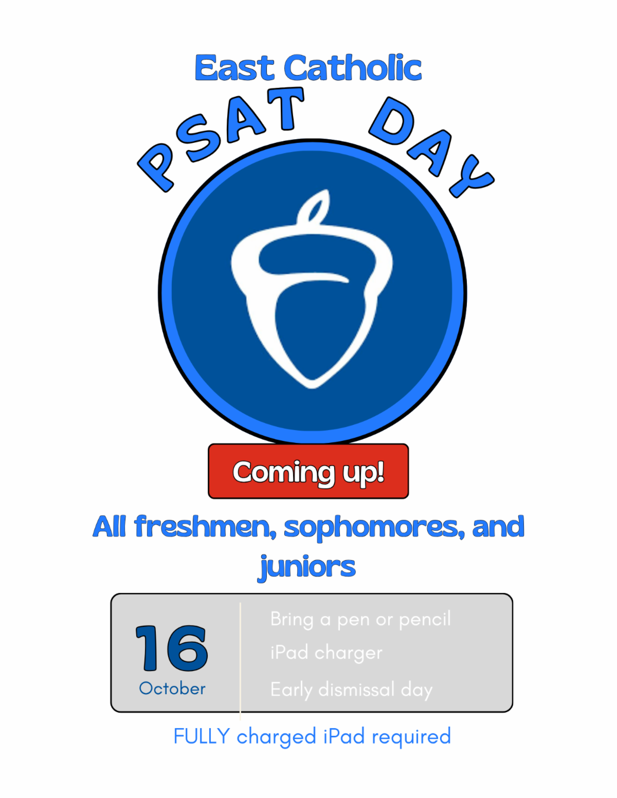 Heads up, Eagles! The PSAT/NMSQT is Thursday, October 16th during the school day! Please note that we will have an 11:00 AM dismissal once testing is complete.