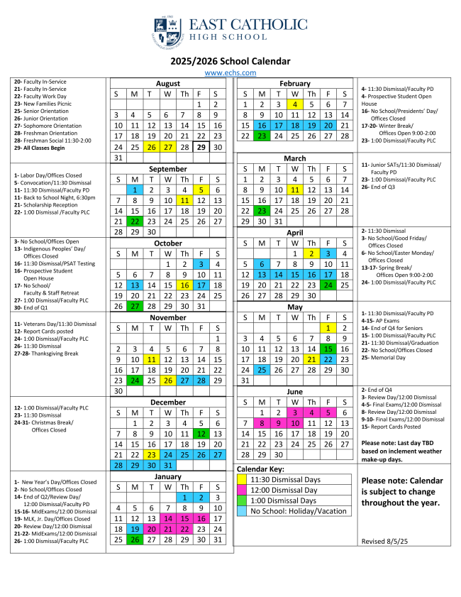 The 2025-2026 School Calendar has been posted to the ECHS website and portal.