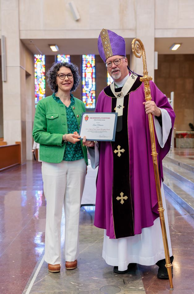 The Annual Educators Mass and Celebration was held at the Cathedral of Saint Joseph in Hartford on May 1st. During the ceremony, Laura Marcucio was named as a recipient of the 2024-2025 Light of Christ Award. This award, presented by the Archdiocese of Hartford and the Archdiocese of Hartford Catholic Schools, recognizes outstanding teachers whose lives are guided by Catholic principles, who serve as inspirational role models to students and peers, and who consistently demonstrate excellence in teaching and learning.