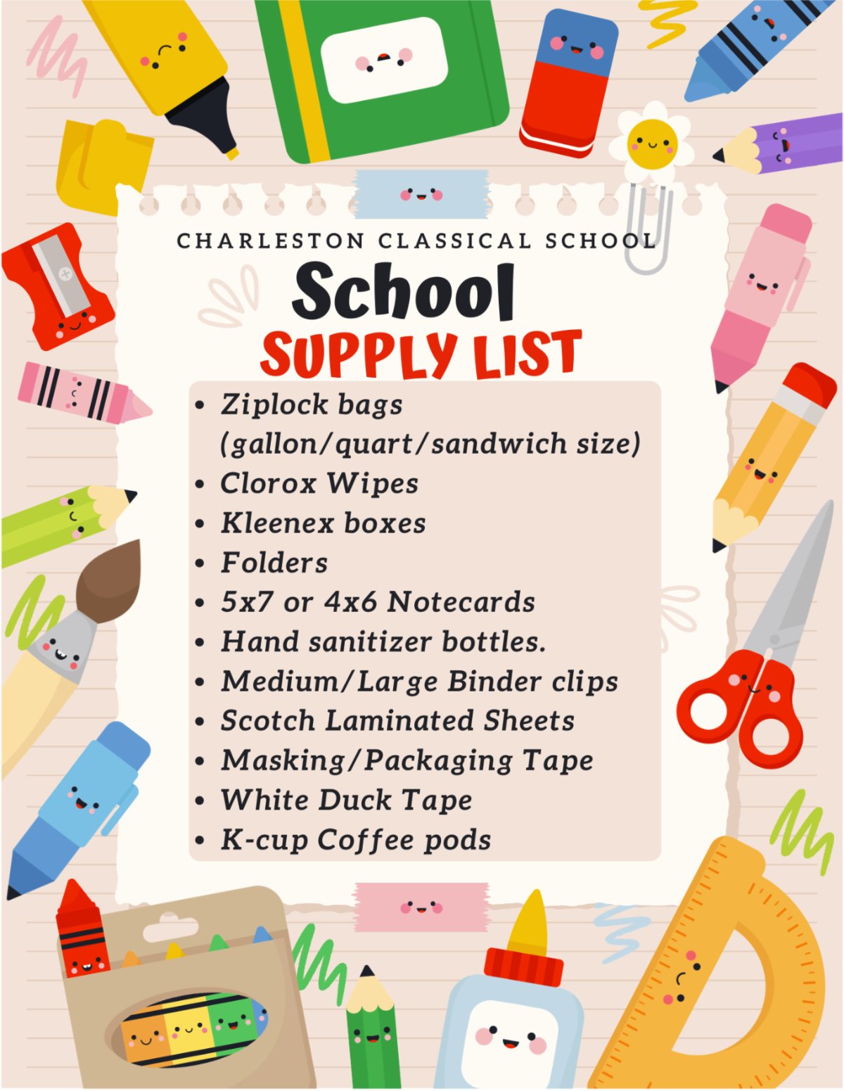 Please bring school supplies for Charleston Classical School on Sunday, August 24. A collection box will be by the lemonade stand.