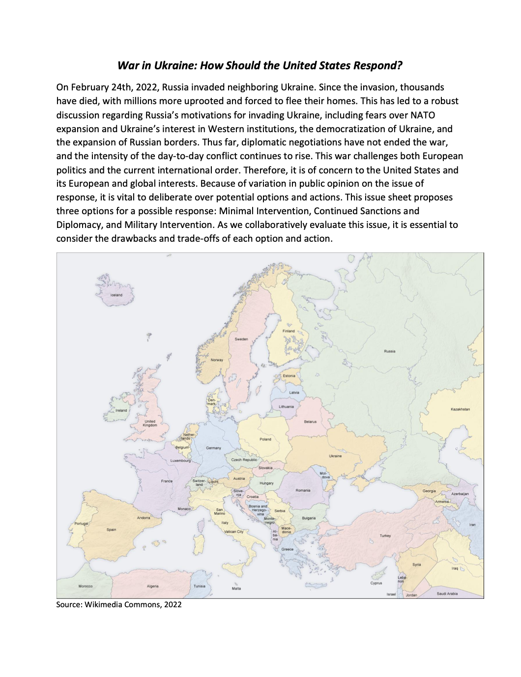On February 24th, 2022, Russia invaded neighboring Ukraine. Since the invasion, thousands have died, with millions more uprooted and forced to flee their homes. This has led to a robust discussion regarding Russia’s motivations for invading Ukraine, including fears over NATO expansion and Ukraine’s interest in Western institutions, the democratization of Ukraine, and the expansion of Russian borders...This issue sheet proposes three options for a possible response: Minimal Intervention, Continued Sanctions and Diplomacy, and Military Intervention.