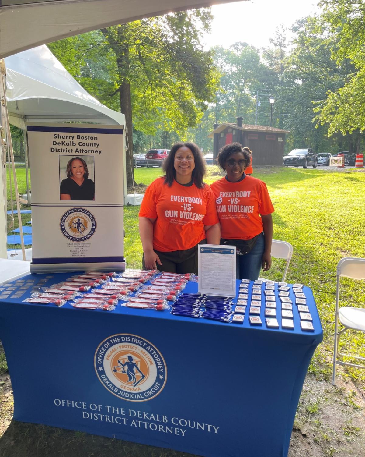 | | Senior Assistant District Attorney TyShawn Jackson and Victim Advocate Shakoa Harper, with the Firearm Violence Prevention Unit, attended the second annual Peace Walk hosted by Emory Hillandale's Violence Prevention Program. The event was held in recognition of National Gun Violence Awareness Month. DA staff provided gun locks to interested participants and took part in the Community Resource Expo. | | |