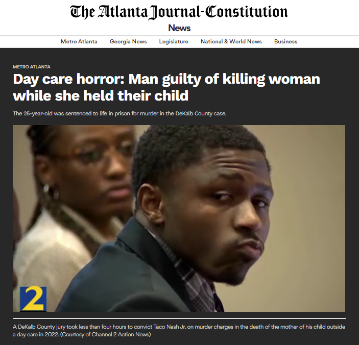 The Lithonia man at the center of the incident, Taco Nash Jr., emerged from a wooded area behind the day care facility on Snapfinger Park Circle with his child in his arms, according to DeKalb prosecutors. The 16-month-old girl, covered in blood, was taken to the hospital with minor injuries, police said.