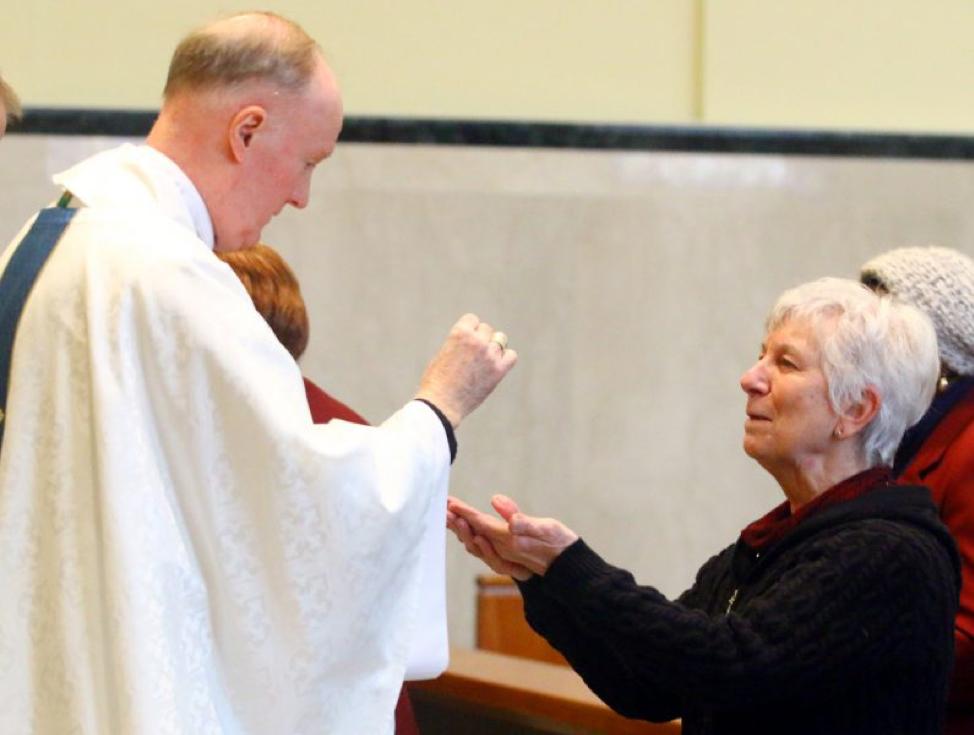 Sister Joanne Mongelli SSJ, currently at Archbishop Wood High School and a Catholic school teacher for 50 years, receives Communion from Bishop Michael Fitzgerald.