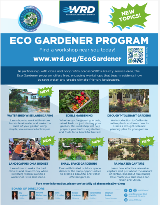 Discover the beauty of sustainable gardening with WRD’s Lillian Kawasaki Eco Gardener Program! Since 2006, WRD has partnered with cities and nonprofits throughout the 43-city service area to provide FREE workshops that educate and inspire. Whether you're interested in drought-tolerant plants, rainwater capture, edible gardening, or irrigation basics, our interactive workshops have you covered.