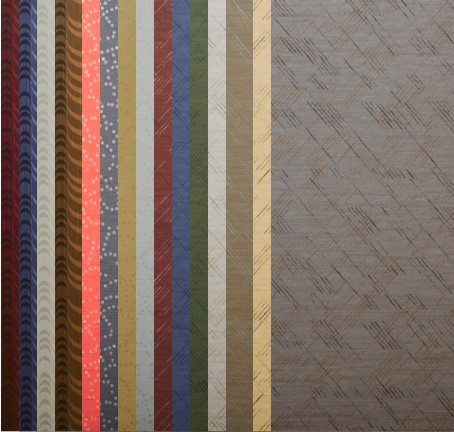 The Jonathan Mark Collection brings together an eclectic mixture of three dimensional textile effects, modern art influences and sculptural carved techniques, all rendered in vibrant color palettes, metallic accents, and presented in durable contract vinyl wall covering. It is manufactured in the U.S. by Fidelity Industries using water based inks, recycled raw materials, and no earth depleting chemicals or solvents.