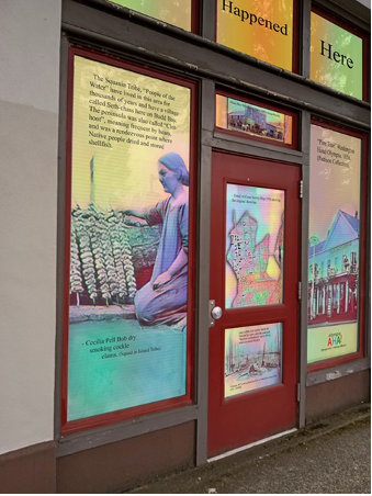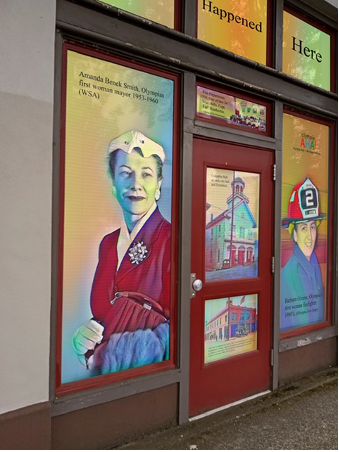 Olympia Arts + Heritage Alliance used a $500 micro grant they were awarded by the Olympia Downtown Alliance, to implement a community project called “It Happened Here,” a multi-panel window display for the windows on the State Street side of this historic building, showing historic photos including: